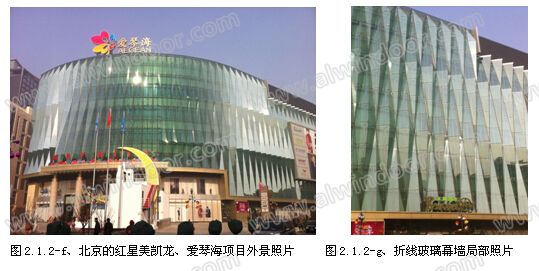 (3)、在玻璃幕墻的外立面上采用玻璃與玻璃之間有規律的折轉面,實現一種新穎的建筑效果,是建筑師常用的建筑藝術一種表現手法。北京的紅星美凱龍、愛琴海項目的立面異形點支式玻璃幕墻,就是采用三角片玻璃做有規律的帆面折線,使玻璃幕墻面能在光的反射下出現活、波靈動的藝術效果。其結構是在內層幕墻外設置了一層鋼管支承結構,用點支式不銹鋼連接系統將結構與面玻璃連接。(如圖2.1.2-f、g)