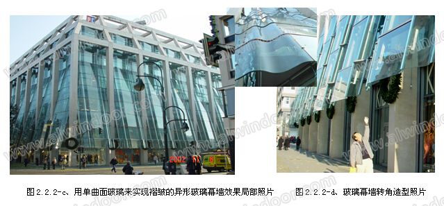 (2)、在異形幕墻的設計中由于單曲面弧形面板的適用范圍廣,面板曲面成型較容易;對幕墻的支承結構體系沒有特殊的要求,特別是在異形玻璃幕墻的應用中,由于單曲面玻璃可以進行鋼化處理,大大提高了玻璃幕墻的安全度,所以單曲面弧形玻璃面板常常使用在兩個平面幕墻的轉角過度造型、實現褶皺的造型效果、拼接成充滿韻律的異形墻面。在實際應用中除玻璃材料外,各種金屬板材、GRC板、pc板、石材和各種人造板材也都大量采用單曲面弧形面板的形式作異形幕墻的面板材料。(如圖2.2.2-c、d)