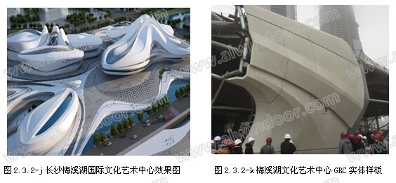 (4)、長沙梅溪湖國際文化藝術中心項目的異形幕墻和屋面的外表面,是采用了異型玻璃面板、異型鋁板面板、異形雙曲面GRC面板拼接成的雙曲面造型。在立面上GRC板與玻璃對接,在頂面GRC板與金屬屋面和玻璃采光頂對接。(如圖2.3.2-j、k)