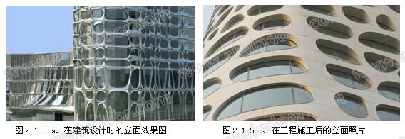 該項目在建筑設計時,建筑師利用金屬板的可塑性性能,在外幕墻的層間上制造了一個奇特的有著夢幻效果的金屬板與玻璃的復合幕墻。讓有著奇異三維造型的金屬板與通透的大透明玻璃有機的形成了一個整體(如圖2.1.5-a)。