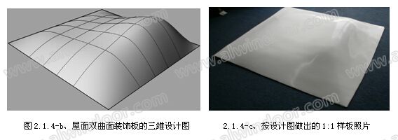 該項目在設計階段,相關設計和曲面板生產單位對方案的可行性進行了充分的分析。同時對難度極大的外墻雙曲面金屬板造形作了1:1的樣板(如圖2.1.5-c\d)。雙曲面板采用的是大型薄壁鑄鋁(詞條“鑄鋁”由行業大百科提供)技術制造成型的,其效果的表現力很好。在能充分展示藝術效果的同時又能保障金屬幕墻自身的安全性能。