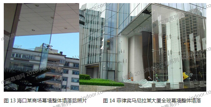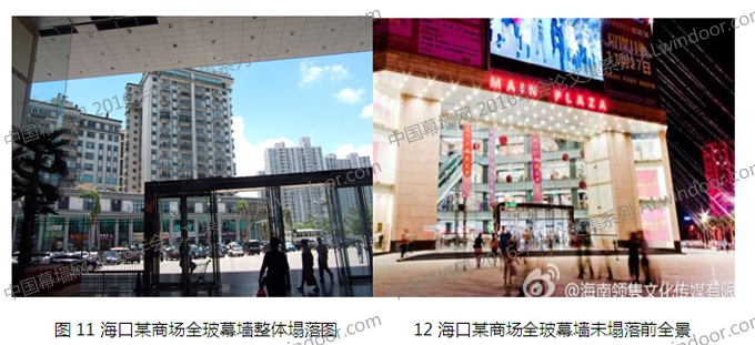 在海南海口市的某商場,大堂的全玻璃幕墻是采用了拼接玻璃肋支撐的點支式玻璃幕墻,在此次超強臺風下整體塌落,只在邊部還有一片面玻璃和半截肋。門(詞條“門”由行業大百科提供)玻璃也有損毀(見圖11)。該幕墻的面板玻璃和肋板玻璃都整體損毀,影響較大。