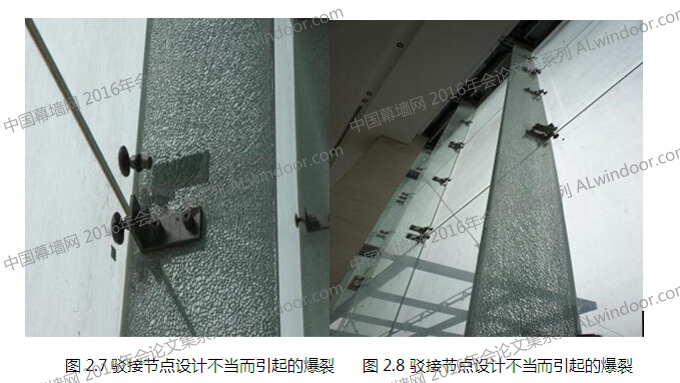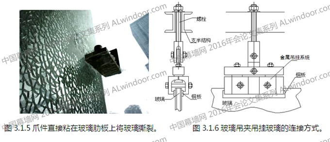 要提醒注意的是在玻璃肋與面板玻璃連接節點設計時,在充分分析其受力狀態、節點適應變形的能力的基礎上,還要對爪件與玻璃肋的連接形式進行分析,要在有效連接的前提下考慮爪件對肋板玻璃的影響。不得采用將爪件未經螺栓壓合,而直接粘節在玻璃肋板上(如圖3.1.3、3.1.4) 已有項目證明,這種連接方式很容易出現在面玻璃受到風荷載作用時,在粘接點的邊緣,由于應力過于集中而將鋼化玻璃壓應力層玻璃撕裂的現象(如圖3.1.5)。