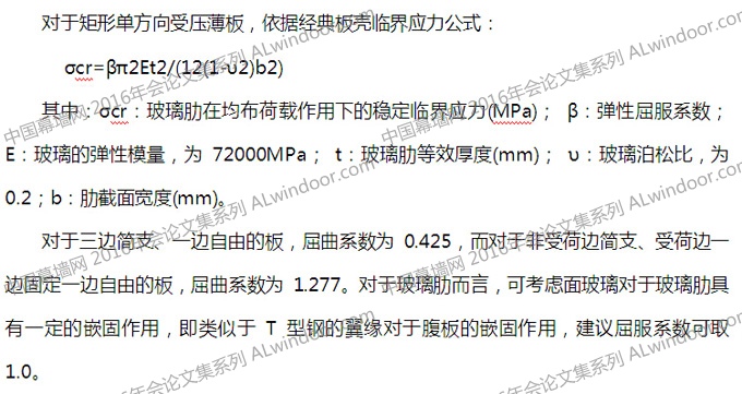 對(duì)于跨度大的玻璃肋在設(shè)計(jì)時(shí)應(yīng)考慮其側(cè)向穩(wěn)定性要求,必要時(shí)要進(jìn)行穩(wěn)定性驗(yàn)算,并采取橫向支撐或拉結(jié)等措施。目前國(guó)內(nèi)對(duì)于玻璃肋的穩(wěn)定性的設(shè)計(jì)及計(jì)算的理論較少,在設(shè)計(jì)計(jì)算時(shí)可以參考經(jīng)典板殼理論和國(guó)外的相關(guān)規(guī)范。對(duì)于玻璃肋結(jié)構(gòu)分析,即使玻璃肋正截面承載力不是由臨界屈曲荷載控制,但是分析玻璃肋臨界荷載仍然有一定的意義。