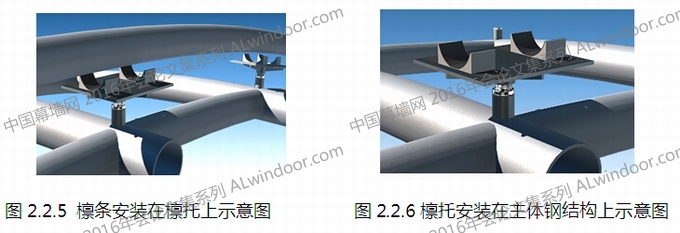圖中的檁條為Φ121×5的鋼管,安裝在檁托上,并且通過U型抱箍緊固件連接固定。在檁條接口位置,檁托上兩個U型抱箍分別固定兩支檁條。檁條的安裝示意(如圖2.2.5-2.2.6)