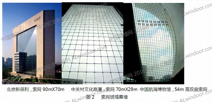 同樣,JGJ 102的新版本與JGJ 102-2003相比,增加了索網玻璃幕墻的內容。2000年以后,索網在幕墻工程中已大量使用,建成了如新保利大廈、中關村文化商廈這樣的超大尺寸的索網;如昆明機場、深圳北站、成都東站這樣的超大面積索網;如同上海中國航海博物館、北京長安中心這樣的雙曲面索網(圖2),并總結了成套的設計施工技術,所以102規范新版本列入相應的條文。