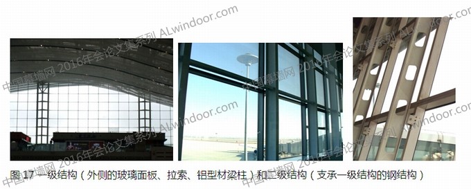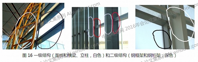 在一些公共建筑的幕墻系統(tǒng)中,構(gòu)成比較復(fù)雜,既有面板和直接支承面板的一級(jí)結(jié)構(gòu),又有支承一級(jí)結(jié)構(gòu)的二級(jí)結(jié)構(gòu)(圖16、圖17)。原則上面板和直接支承面板的一級(jí)結(jié)構(gòu),設(shè)計(jì)使用年限應(yīng)不小于25年;支承一級(jí)結(jié)構(gòu)的較大的二級(jí)結(jié)構(gòu)設(shè)計(jì)使用年限應(yīng)與主體結(jié)構(gòu)相同。