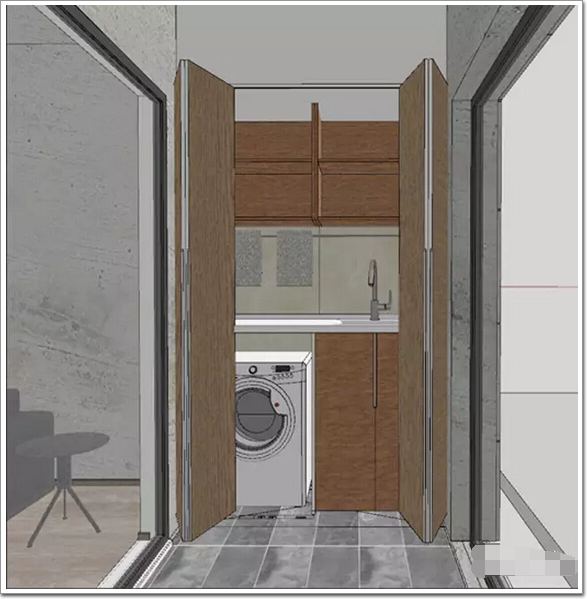 陽(yáng)臺(tái)家政區(qū):將洗衣機(jī)、洗滌槽統(tǒng)一設(shè)置在陽(yáng)臺(tái)一側(cè),通過(guò)防夾手折疊門(mén)作為功能空間分界面;將折疊門(mén)封閉后,即可呈現(xiàn)出優(yōu)雅的陽(yáng)臺(tái)生活空間