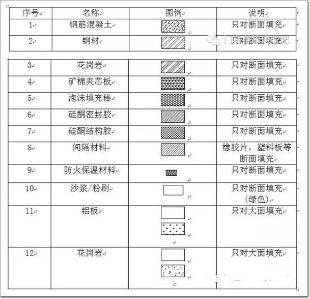 • 用不同的填充圖案表示不同材料,并將填充圖案放于同一圖層之上。常用的材料填充圖案詳見《關于幕墻圖例填充的設計標準》。