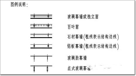 • 不同幕墻種類的表達:為了能在平面圖中清楚表達、區分出不同幕墻種類,現將不同圖例列出如下所示: