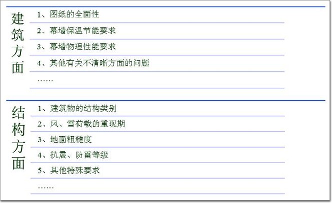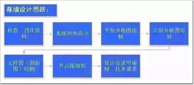 幕墻工程設計內容一般包括:設計總說明、技術要求、立面分格圖、平面(詞條“平面”由行業大百科提供)分格圖、大樣圖(剖面圖)、節點圖、埋件圖、工藝圖等等。