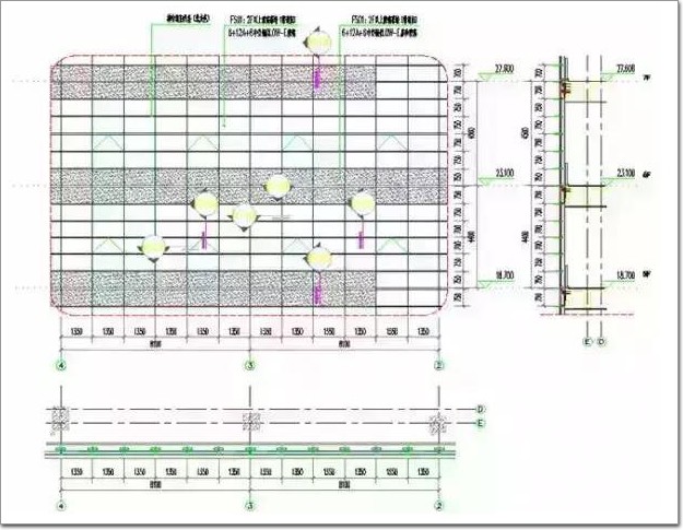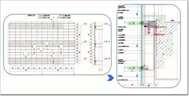 表達清楚:幕墻的分格尺寸、龍骨的定位尺寸(與軸線、標高線之間的關系)、面板材料的運用等。