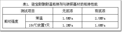 表1所示為硅寶耐酸耐溫粘接劑與碳鋼基材的粘接性能,測試標準參考GB/T 7124。可以看出,在常溫狀態(tài)、不涂刷底漆的條件下,其粘接強度也能達到1.5MPa。