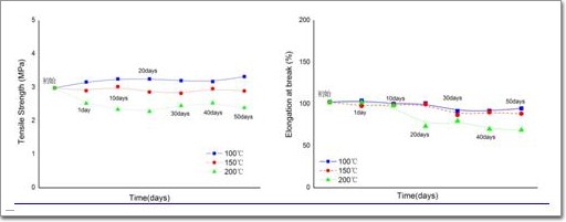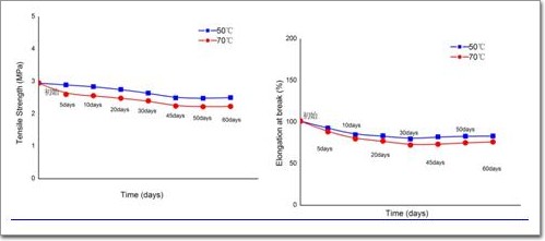 由圖可以看出,到測試后期,即樣品浸泡45天以后,粘接劑的拉伸強度和斷裂伸長率變化小趨于穩(wěn)定,防腐材料與環(huán)境實現(xiàn)了平衡。在浸酸60天之后,50℃和70℃條件下的性能保持率均在80%以上,可見該產(chǎn)品具有良好的耐酸性能,從而為實際煙囪的運行提供防腐保護。