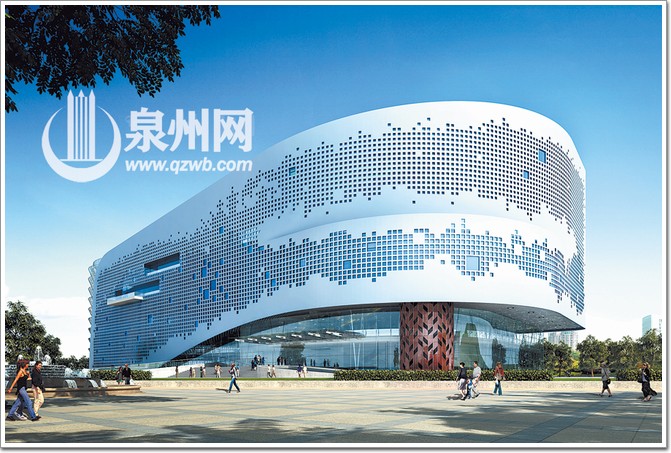 四個場館采用了各自不同的主題和設計理念,泉州圖書館以“知識浮島”為設計理念,總建筑面積55140平方米,設計藏書量200萬冊,可容納2250位讀者同席閱覽圖書,圖書館地面有七層,地下有一層,其中地面第一層配備有讀書自習區(qū)、展廳、餐廳、視障閱覽室。