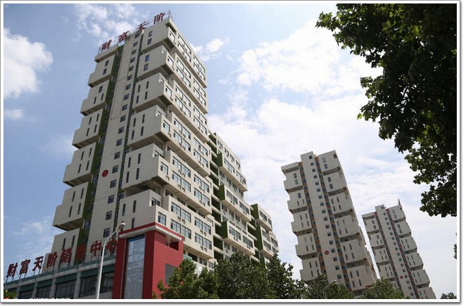 據悉,該建筑群實際上名為“財富天階”,三幢大樓均為小戶型公寓,是鄭州東業冠達房地產公司旗下為富士康公司量身打造的綜合項目,集居住、文化、娛樂、購物等多種功能于一體,旨在為產業工人提供社會公益和生活配套服務。財富天階占地南積33685平方米,建筑面積126693平方米,綠化率25%,容積率4.0,公寓層高3.4米,共三棟,每棟樓自東向西依冷飲為12層、16層和22層,每棟有3個單元,地下三層,負1為商業配套,負2-3為停車區。