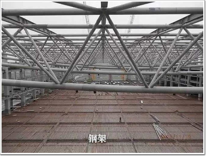 屋頂曲面網殼尺寸200m×72m,中間無柱,局部開大洞,對結構的削弱非常大。通過計算分析,擬采用正放四角錐網殼,局部開洞處環向加強。
