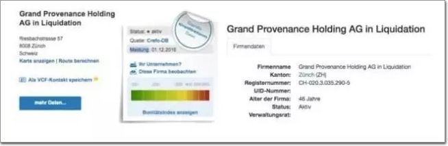 據透露,該事件涉及到兩個瑞士公司,同時由劉忠田所有,就是Eighty Eight Investments AG和Grand Provenance Holdings AG。而根據查詢這兩家公司正在清算當中。