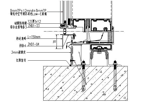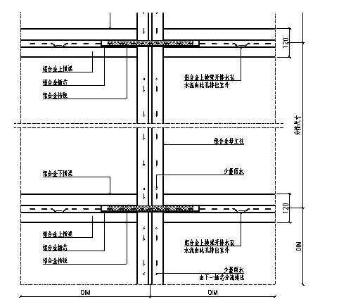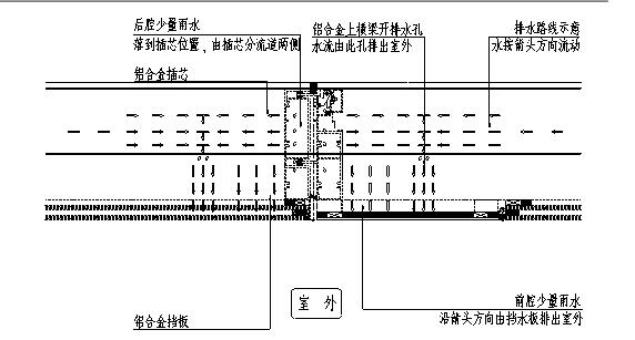 直排式單元式幕墻系統:當雨水經過第一道膠條時,大量雨水會因自重而下落。很少量雨水在一定的壓力下進入前腔,橫梁前腔位置的雨水也會向兩側流淌,到達立柱位置,雨水會因自重而下落,向下一層匯集。而當少量的前腔雨水在較高壓力下進一步越過第二道密封膠條進入后腔時,幕墻上橫梁后腔前端設置一道排水小腔,橫梁加工時,在避開橫向滑槽位置兩側開孔至排水小腔,將進入后腔部分的雨水通過排水孔排到排水小腔,再通過排水小腔向橫梁兩側流淌至立柱前腔位置,雨水因自重而下落至下一單元板塊,在向下一層匯集。按照此規律,每層重復如此排水方式。所有雨水匯集到最底層單元板塊下方的前部接水排水槽之后向室外排出。