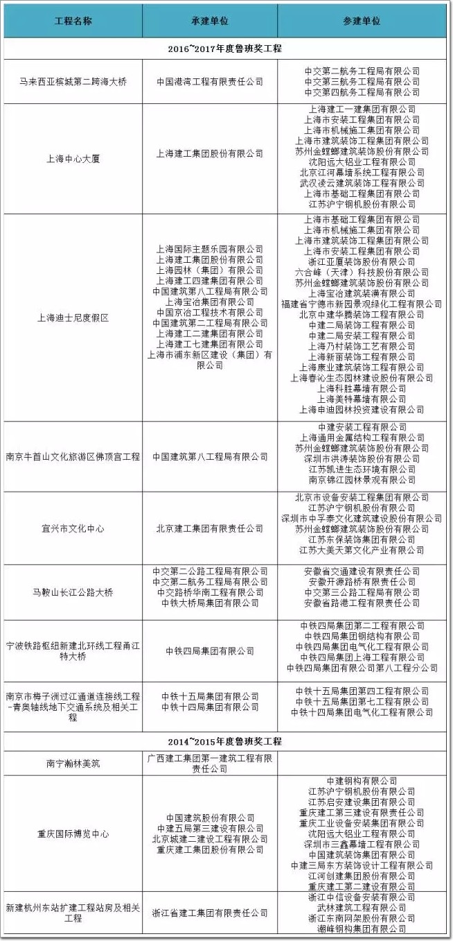 其中,上海中心大廈、上海迪士尼度假區、南京牛首山文化旅游區佛頂宮工程、宜興市文化中心、馬鞍山長江公路大橋;馬來西亞檳城第二跨海大橋、寧波鐵路樞紐新建北環線工程甬江特大橋、南京市梅子洲過江通道連接線工程-青奧軸線地下交通系統及相關工程等8項工程獲2016~2017年度魯班獎,重慶國際博覽中心、新建杭州東站擴建工程站房及相關工程、南寧•瀚林美筑等3項工程上榜2014~2015年度魯班獎名單。