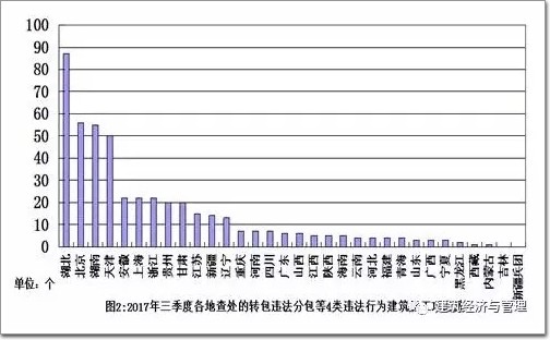 從查處的轉(zhuǎn)包、違法分包等4類違法行為看,湖北、北京、湖南3省(市)查處項目相對較多(見圖2)。