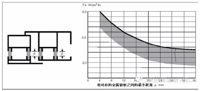 斷熱鋁合金型材的傳熱系數主要與隔熱條的間隔寬度d的大小有關,按照《建筑門窗玻璃幕墻熱工計算規程》JGJ/T151-2008給出的隔熱條寬度與斷熱金屬(詞條“金屬”由行業大百科提供)型材傳熱系數的關系見下圖。