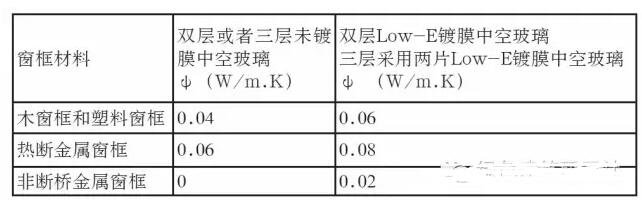 線傳熱系數ψ主要受間隔層材料傳導率的影響。在沒有精確計算的情況下,可采用下表估算窗框與玻璃結合處的線傳熱系數ψ: