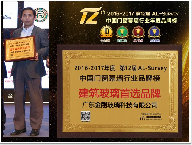 此外,在全國鋁門窗幕墻行業(yè)年會(huì)其間,還舉行了由中國建筑金屬結(jié)構(gòu)協(xié)會(huì)主辦,中國幕墻網(wǎng)ALwindoor.com承辦的“第十二屆AL-Survey2016-2017中國幕墻網(wǎng)年度大型讀者調(diào)查暨‘我最喜愛幕墻工程’評(píng)選活動(dòng)”的頒獎(jiǎng)儀式,該活動(dòng)自2005年創(chuàng)立以來,迄今已連續(xù)舉辦12屆,堅(jiān)持“沒有黑馬,實(shí)至名歸”的評(píng)選風(fēng)格,已成為廣大房地產(chǎn)開發(fā)商、設(shè)計(jì)院以及行業(yè)專家、顧問咨詢公司等讀者群體進(jìn)行品牌選擇和產(chǎn)品選購的重要參考依據(jù)。而每屆的“我最喜愛幕墻工程”評(píng)選,更是以其“新、奇、高、大”的入圍標(biāo)準(zhǔn),被喻為“魯班獎(jiǎng)”的前哨站,金剛玻璃不負(fù)眾望以19492票獲得建筑玻璃類首選品牌大獎(jiǎng)。