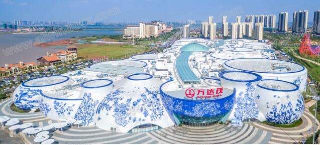 南昌萬達茂幕墻工程采用了江西特色的青花瓷圖案,幕墻最大標高25.9米,建筑立面由29個雙曲面青花瓷造型組成,是目前世界上最大的青花瓷建筑。主要幕墻類型為13mm厚瓷板幕墻(詞條“瓷板幕墻”由行業大百科提供)和3mm厚鋁板幕墻,幕墻面積約7.9萬平方米,實景照片見圖6。