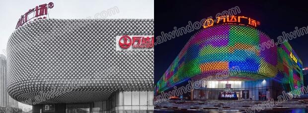 武漢萬達K5幕墻工程最大標高40.6米,主要幕墻類型為鋁板幕墻和直徑為600mm的帶LED(詞條“LED”由行業大百科提供)的不銹鋼金屬球,幕墻面積約3.5萬平方米,實景照片見圖9。