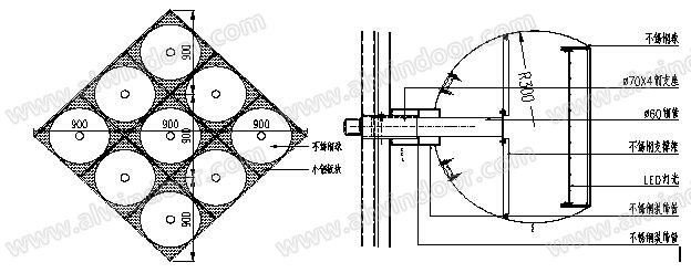 武漢萬達K5不銹鋼球幕墻工程最大的特點是在鋁板幕墻上打孔,外側安裝直徑為φ600mm不銹鋼球,不銹鋼球總數為4.3萬多個,而每個不銹鋼球正立面又安裝了大小不一的LED照明。由于原招標圖設計為框架式幕墻,所有鋁板和不銹鋼球需在現場安裝,容易造成在鋁板幕墻上打孔后再安裝不銹鋼球時的防水問題以及4.3萬多個不銹鋼球如何保質保量地安裝。
