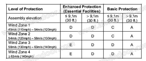在進(jìn)行防颶風(fēng)設(shè)計時,可根據(jù)美國大西洋海岸的不同風(fēng)區(qū)、不同建筑高度和建筑物保護(hù)類別,確定門窗、幕墻防風(fēng)攜碎物沖擊級別((圖11~圖12)。