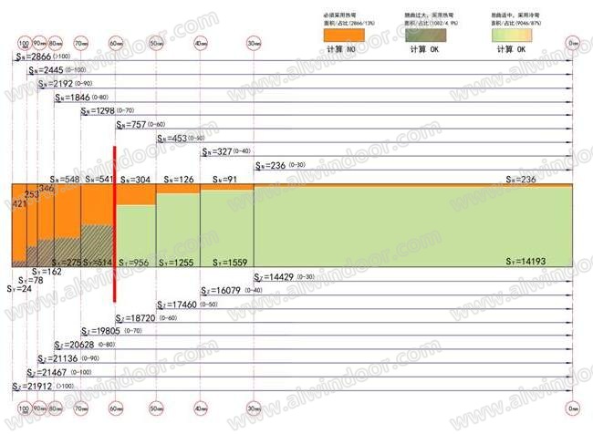 對于滿足計算要求的玻璃由于玻璃板塊平面翹曲階差范圍涵蓋0-140mm之間,考慮到目前國內外冷彎技術實施案例、使用安全要求及效益最大化原則,經過安全與經濟性價比綜合分析(如圖3.5.4)。確定大鳥屋面冷彎玻璃,在計算滿足要求但平面翹曲值大于60mm的玻璃板塊采用熱彎技術實現曲面造型。