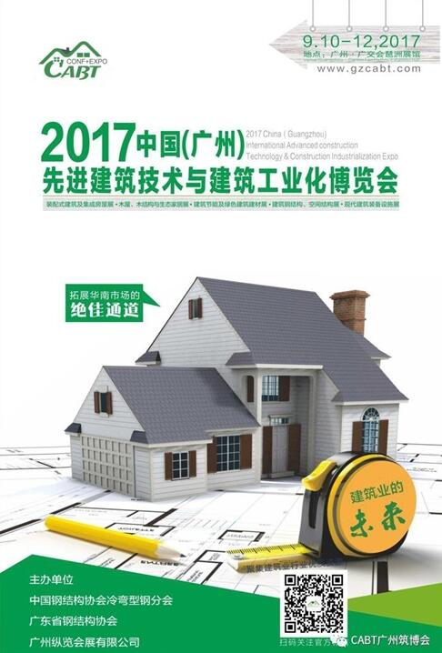 為了推動綠色建筑、建筑裝工業化技術的發展,契合廣東省以及國家大力發展裝配式建筑的發展戰略,由中國鋼結構協會冷彎型鋼分會、廣東省鋼結構協會、廣東省現代建筑工業化產業技術創新聯盟、廣州縱覽會展有限公司等單位聯合舉辦的“2017中國(廣州)先進建筑技術與建筑工業化博覽會”(中文簡稱:中國筑博會、英文簡稱:CABT2017)定于2017年9月10-12日在廣州舉行,同期將舉辦“第二屆中國(廣州)國際冷彎型鋼博覽會”、“2017中國國際裝配式建筑高峰論壇”、“2017中國(廣州)國際特色小鎮高峰論壇”、“建筑科技大會”、“國際冷彎成型學術會議”等展覽及會議。展會得到中國鋼鐵工業協會、中國貿促會冶金行業分會、中國鋼結構協會、亞洲經濟發展協會裝配式建筑專委會、中國建筑產業化聯盟以及歐洲、韓國、臺灣、香港等相關機構的支持。