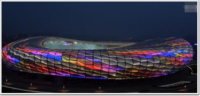 體育場造型為飄逸的曲線形態,外形構造類似足球表面皮革的拼接,表皮采用ETFE膜結構(詞條“膜結構”由行業大百科提供)幕墻,這種材料可以使體育場更加富有多面的表現力,通過藍色及白色的組合,并呈海浪起伏般的變化,體現了大連的足球文化和海洋文化。該體育場是目前世界上僅次于北京水立方膜結構面積的大型單體建筑,其外觀采用的膜結構幕墻超10萬平米,該項幕墻工程由沈陽遠大完成。