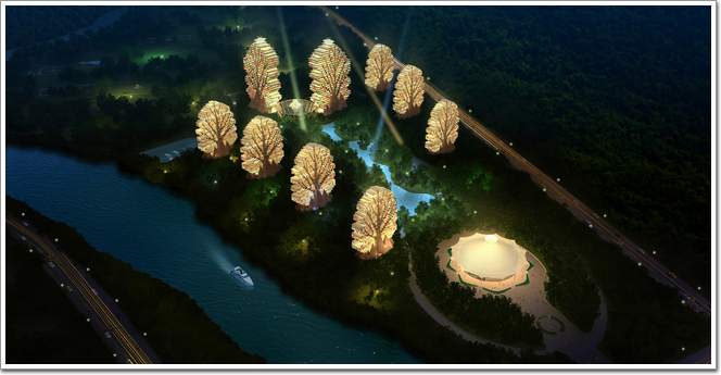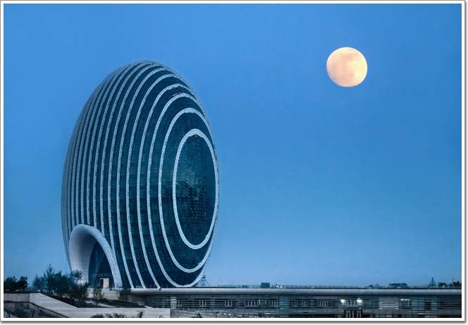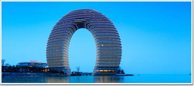 湖州馬蹄形酒店,它像一個倒U狀的馬蹄,類似于傳統中國畫中描繪的舊橋,很有創意。白天看它是一座雅致的建筑物,到了晚上開啟從地板到最高層一圈一圈的LED燈,其多變的燈光倒映到夜晚的太湖湖面上,流露出一種奢華的風情。