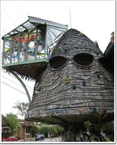 這間蘑菇形房屋位于美國俄亥俄州辛辛那提市,是建筑設(shè)計(jì)師特里?布朗(Terry Brown)的家兼工作室,同時(shí)也是辛辛那提市最主要的地標(biāo)(詞條“地標(biāo)”由行業(yè)大百科提供)和著名住宅。布朗是辛辛那提大學(xué)建筑設(shè)計(jì)學(xué)院教授,從1992年到2006年間,布朗一直在致力于這所房屋的設(shè)計(jì)與建設(shè),這個(gè)外形怪異的建筑就好象是由波浪形的木料和一大堆雜亂的材料粘合在一起形成的,看起來像是蘑菇。 蘑菇房的神奇設(shè)計(jì)并不僅僅局限于外觀,在其內(nèi)部到處安裝著精巧的櫥柜,墻壁上鑲嵌著多彩的巖石。這樣一棟高度藝術(shù)化的建筑,與我們通常所認(rèn)識的住宅完全不同。