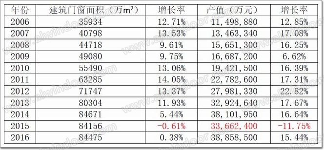我國建筑門窗行業隨著建筑業的快速發展取得了重大成就。行業通過三十多年的發展,在人才、技術、管理和工程實踐等方面取得了長足進步。近十年,建筑門窗的產量、產值和增長率如下表所示。