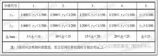由于Y軸維度和Z軸維度的檢測方法是本標(biāo)準(zhǔn)新修訂的內(nèi)容,因此標(biāo)準(zhǔn)中相應(yīng)增加了Y軸維度方向?qū)娱g位移角和Z軸維度方向高度變化量作為分級(jí)指標(biāo)值。幕墻平面內(nèi)、平面外變形性能分級(jí)仍然是以層間位移角作為分級(jí)依據(jù),且層間位移角的指標(biāo)值相同。以一個(gè)立方體的主體結(jié)構(gòu)為例,其拐角部位的幕墻在地震作用下,一個(gè)面承受X軸維度的變形,則另一個(gè)面承受的是Y軸維度的變形,且在同一高度下,其位移變形量和層間位移角一致。因此,分級(jí)表中γx和γy的指標(biāo)值是相同的。垂直方向變形沒有層間的概念,其分級(jí)指標(biāo)值是按照層間高度變化量作為分級(jí)依據(jù)。垂直方向變形量主要應(yīng)考慮到地震、溫度等外力作用下的變形量,而不應(yīng)考慮到材料加工、人工安裝誤差等因素導(dǎo)致的變形量。