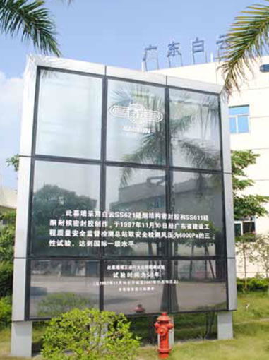 1997年,白云化工在公司廣場自建了一幅計劃曝曬50年的實體幕墻,并定期采樣測試獲得實驗數(shù)據(jù),開創(chuàng)50年極限測試先河。