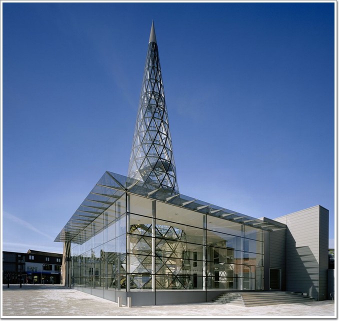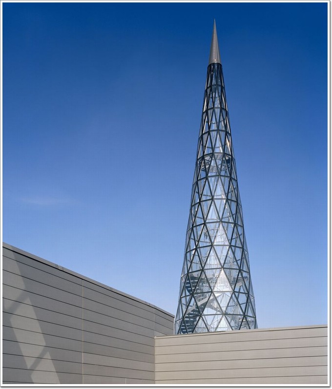 該項(xiàng)目是一座全玻璃建筑,直徑8米,總高度為30米,整體成圓錐形,項(xiàng)目利用現(xiàn)代設(shè)計(jì)手法令空間與其展示的藝術(shù)品無(wú)縫交融,形成一個(gè)統(tǒng)一的整體。玻璃中心由兩個(gè)相互聯(lián)系且相互作用的玻璃區(qū)構(gòu)成,首先是由不銹鋼框架構(gòu)成,用超透明玻璃幕墻覆蓋的平行六面體;其次,是三角形構(gòu)架組成的玻璃圓錐體,也是玻璃中心的標(biāo)志性建筑元素,被看作是第五個(gè)立面的屋頂,會(huì)在以后進(jìn)行特殊的處理。該結(jié)構(gòu)強(qiáng)調(diào)了玻璃中心的多功能性(教育、信息、服務(wù)、展覽和玻璃生產(chǎn))。該建筑的結(jié)構(gòu)正好適應(yīng)了此多功能性,以各種創(chuàng)新的方式利用玻璃。