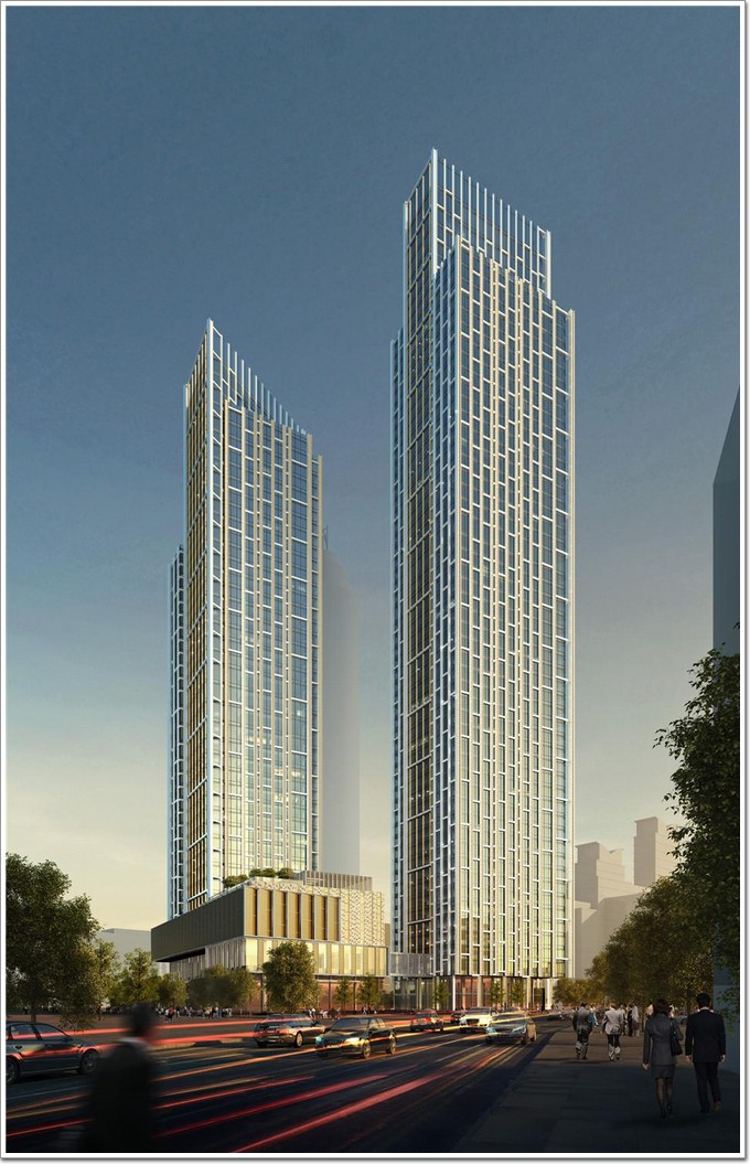 目前,該項目還處于緊張建設階段。值得一提的是,日前我國幕墻巨頭沈陽遠大再次傳來捷報,憑借著雄厚的技術實力和對工程精益求精的態(tài)度簽約該項目幕墻工程,在這個金秋時節(jié),對沈陽遠大來說,真是一個收獲果實的季節(jié)。該慕墻工程由遠大歐洲分公司負責設計施工,共包含2座主樓和1座裙樓,其中裙樓主要由鋼框架幕墻構成,表面處理為金色冷噴漆。外墻由造型裝飾框結構組成,整個立面外側包含大量的豎向鋁造型裝飾框,幕墻面積達55000平方米。