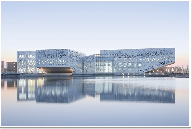 多向度的體量布局與覆蓋其上的鋁板材料幕墻結合,消解了慣常依據太陽軌跡所設定的“方向性”和“立面性”,從而組織最大化的陽光捕獲。伴隨著學生于各功能房間的活動亦或是隨機的發現,貫穿起不同條件下的室內光影體驗。立面幕墻在數理參數的控制下形成紋理單元,結合會議中心、活動室以及音樂廳等不同的功能用房,自由實現對內部光線投射量的控制,成為最大化捕獲優質光線的“過濾網”。原真白色的肌理單元起始大地,連續、完整的貫串建筑,模糊二者之間界線的同時,將建筑與自然環境之間輕盈的漂浮感進一步凸顯。大報告廳24米懸挑于湖西草地之上。