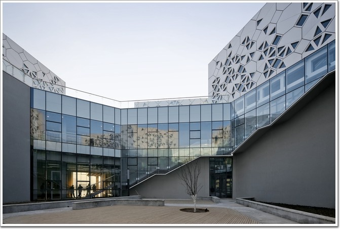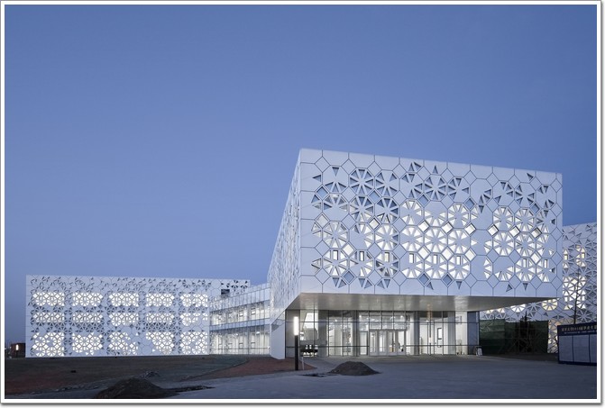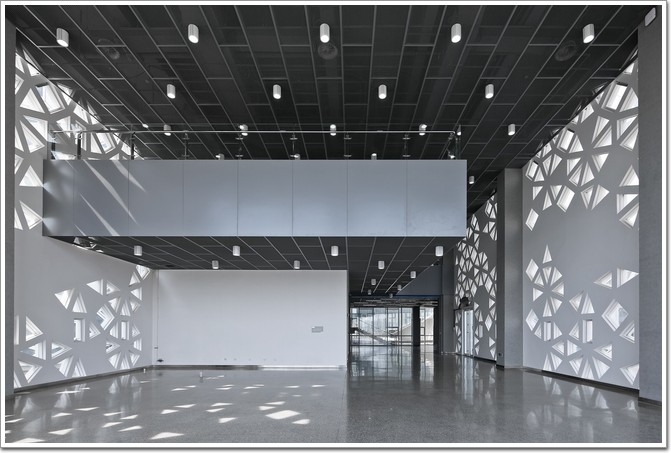 外立面包裹的搪瓷鋁板材料幕墻,與穿孔鋁板一起采用雙層表皮的做法,成為實現自然與光線營造的建構基礎。對簡單的幾何元素基于其特性進行研究,立面構件被設計成一系列的以不同采光孔數目和旋轉為邏輯改變采光率的八邊形幾何構件,在梁柱界定的正交網格基礎上,以2mX2m為基本模數,由高采光率的連續變化到封閉的低采光率景窗,使得建筑內部、走廊以及各活動教室和周邊環境間建立起了視覺聯系,這也是順承既定內部功能需要的合理結果。裝配式的構件模塊簡化了建造程序的同時,提高了施工精準程度與可控性。