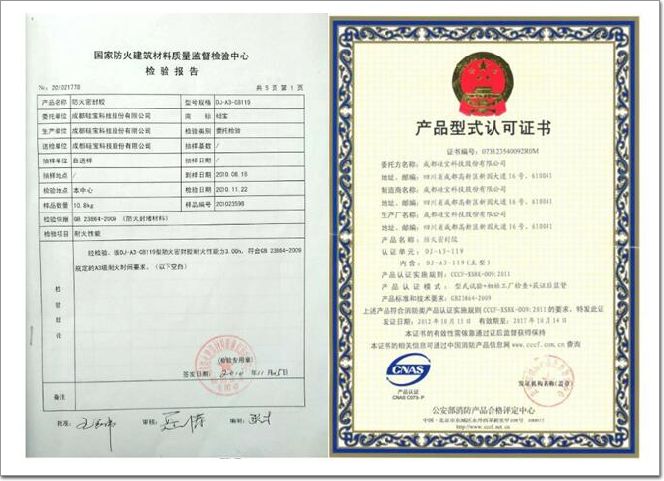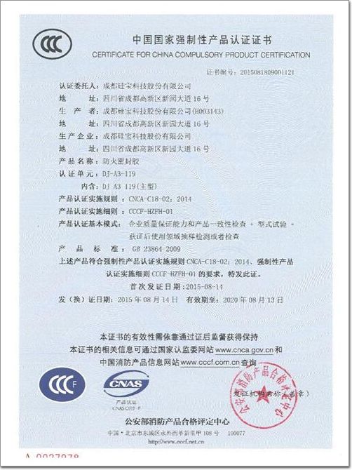 2015年8月,硅寶DJ-A3-119防火密封膠通過(guò)中國(guó)強(qiáng)制性產(chǎn)品認(rèn)證(CCC認(rèn)證)機(jī)構(gòu)嚴(yán)格的審核,獲得公安部消防產(chǎn)品合格評(píng)定中心頒發(fā)的中國(guó)國(guó)家強(qiáng)制性產(chǎn)品認(rèn)證CCC證書(shū),是行業(yè)內(nèi)第一批獲得該證書(shū)的企業(yè)。公安消防部門(mén)會(huì)不定期到公司進(jìn)行飛行檢查,檢查包括:原材料的檢測(cè)、生產(chǎn)工藝流程、成品檢測(cè)、貨物流向以及隨機(jī)抽樣進(jìn)行復(fù)檢。