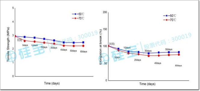 從上表可以看出,硅寶耐溫耐酸粘接劑在經(jīng)過溫度沖擊30個(gè)循環(huán)之后的產(chǎn)品性能依然保持良好,其拉伸強(qiáng)度保持率在98.6%,斷裂伸長(zhǎng)率保持率在97%。