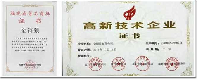 公司全面導入ISO9001:2008質量管理體系認證、ISO14001:2004環境管理體系認證、OHSAS18001:1999職業健康與安全認證,并先后被評為“國家高新技術企業”“廈門市守合同重信用企業”“廈門市質量放心企業”“廈門市誠信示范單位”,其“金鋼狼®”品牌先后榮獲“福建省著名商標”、“福建省建設科技成果推廣項目”、“廈門市著名商標”等榮譽稱號。在經濟全球化中,公司始終堅持產品技術革新及品牌創新的理念,內促團結協作,外求互惠共贏,竭誠與海內外合作伙伴深化合作,共謀發展!