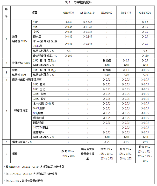 SSG體系面板-框架的連接依靠結(jié)構(gòu)密封膠(詞條“結(jié)構(gòu)密封膠”由行業(yè)大百科提供)粘接實現(xiàn),荷載分布和位移特性不同于其他連接形式。SSG體系要求結(jié)構(gòu)密封膠不僅有足夠的粘結(jié)強(qiáng)度,而且有足夠的彈性,能補(bǔ)償結(jié)構(gòu)變位且又不產(chǎn)生過大的誘發(fā)應(yīng)力。這就要求選擇的結(jié)構(gòu)密封膠具有適用的力學(xué)特性。本文將圍繞中國國家標(biāo)準(zhǔn)GB16776《建筑用硅酮結(jié)構(gòu)密封膠》、行業(yè)標(biāo)準(zhǔn)JG/T475《建筑幕墻用硅酮結(jié)構(gòu)密封膠》、美國ASTM C1184《硅酮結(jié)構(gòu)密封膠標(biāo)準(zhǔn)規(guī)范》及歐洲ETAG002《結(jié)構(gòu)密封膠裝配系統(tǒng)技術(shù)審核指南》等國內(nèi)外知名硅酮結(jié)構(gòu)密封膠標(biāo)準(zhǔn),闡述分析建筑用硅酮結(jié)構(gòu)密封膠產(chǎn)品的主要力學(xué)性能。