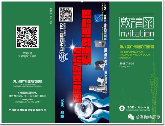 2018年7月8-10日,我們誠(chéng)摯邀請(qǐng)您參加廣州遮陽(yáng)門窗展覽會(huì)攜手打造名品薈萃、特色鮮明、效果顯著、點(diǎn)石成金的豐收盛宴!我們?cè)谶@里等您!