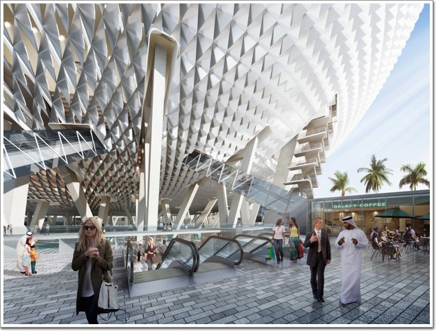 項目為了使結構占地最小的空間,在下方創建一個陰影入口廣場,體育場地被抬高了距的地面60英尺。帶有傾斜角度座位的碗狀體量從平面上升,由圓形陣列的V形柱支撐。整個結構被包裹在可滲透的立面之下,允許氣流通過,同時阻擋不必要的沙土和陽光。